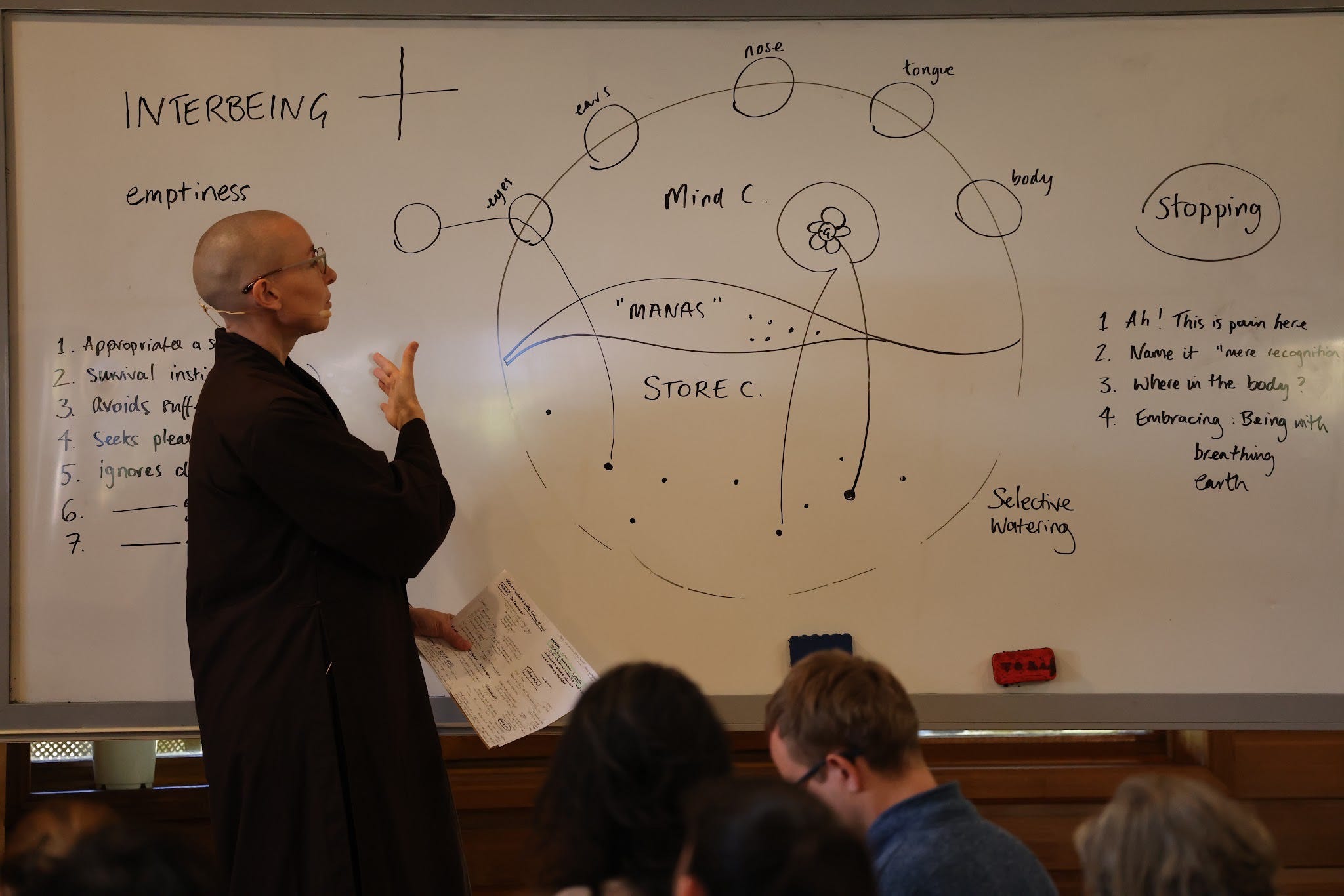 Sister True Dedication offered that morning’s dharma talk, using a huge white board to map out key concepts. A little ways in, she shared that she’d heard an interesting question the day before: How do I not hate humans? Though still in noble silence, a murmur floated through the large hall. Perhaps some audible mix of familiarity (yeesh, I know that question well) and discomfort (that is so not what I want to feel, nor others to feel).
